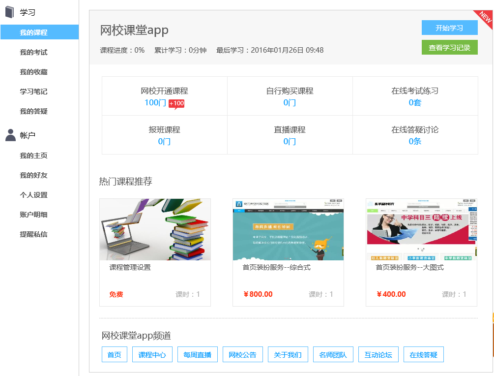 我的課程頁面把網(wǎng)校相關(guān)的開通課程、購買課程、直播課、考試練習(xí)、答疑討論、報(bào)班課程等信息分開展示,而且支持快速進(jìn)入。