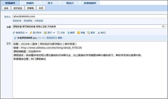 參照該申請模板及示例進(jìn)行郵件填寫,發(fā)送至郵箱( yli@ablesky.com)。經(jīng)審核符合推廣條件的課程,能力易課運(yùn)營部將在2個工作日內(nèi)進(jìn)行課程推送,不符合條件的課程將會進(jìn)行郵件反饋,告知不合格原因,機(jī)構(gòu)修改后再次發(fā)送郵件,達(dá)標(biāo)后進(jìn)行推廣。