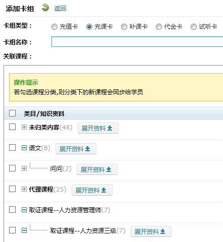 2 若充課卡綁定課程時勾選了對應的課程類目,則對應類目下新增課程自動同步給學員