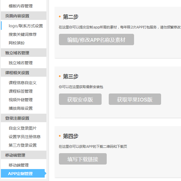 進入網(wǎng)校后臺---系統(tǒng)---App定制管理---完成4步操作,即可生成下載頁面和二維碼