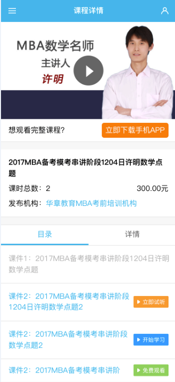 2.課程設(shè)置為完整試聽后前臺即顯示該課件為完整試聽,用戶可通過點(diǎn)擊完整試聽,播放該視頻課件。