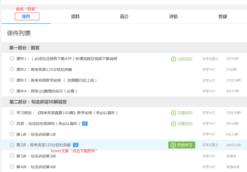 立即試聽、完整試聽按鍵一直顯示,開始學(xué)習(xí)按鍵只有鼠標(biāo)移入時才顯示。