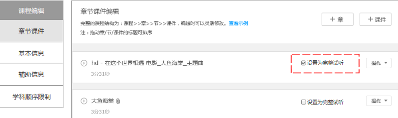 1.在網(wǎng)校后臺可以在課程編輯頁面,章節(jié)頁面去設(shè)置課件完整試聽