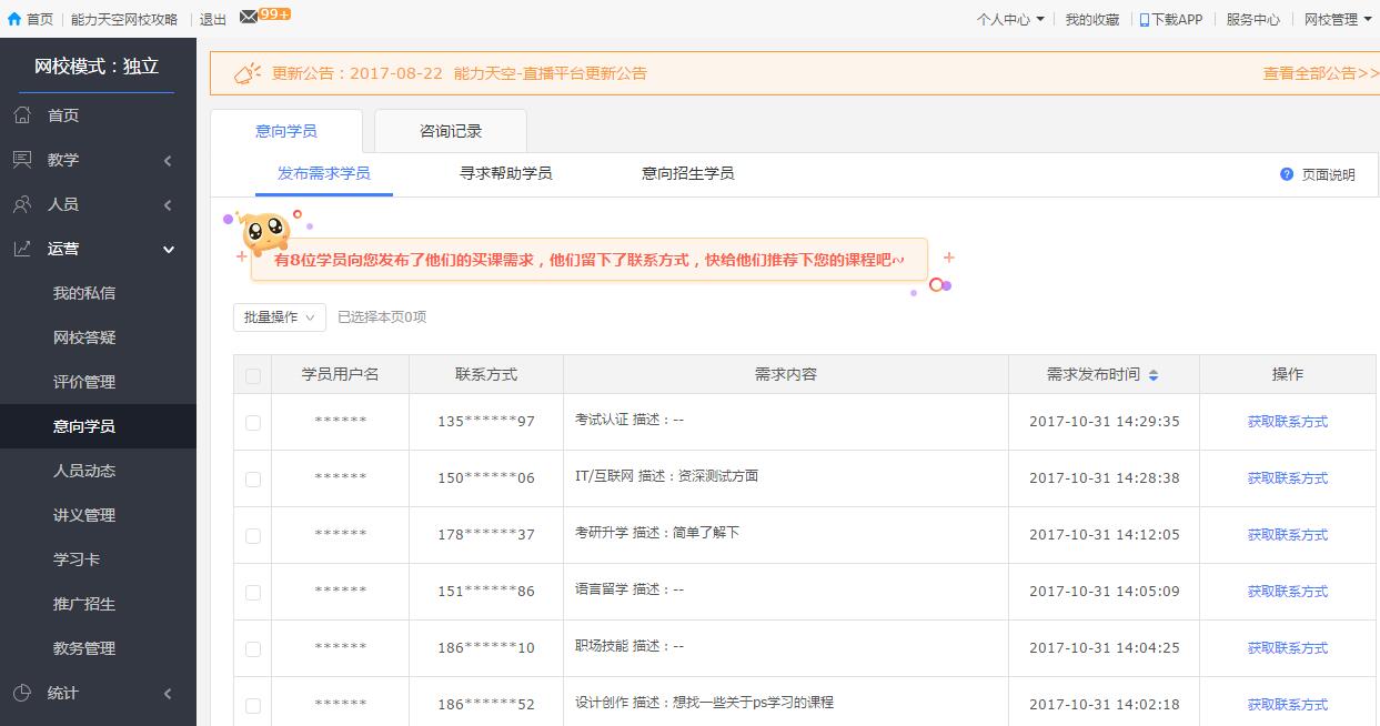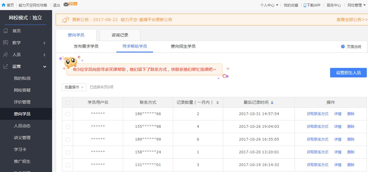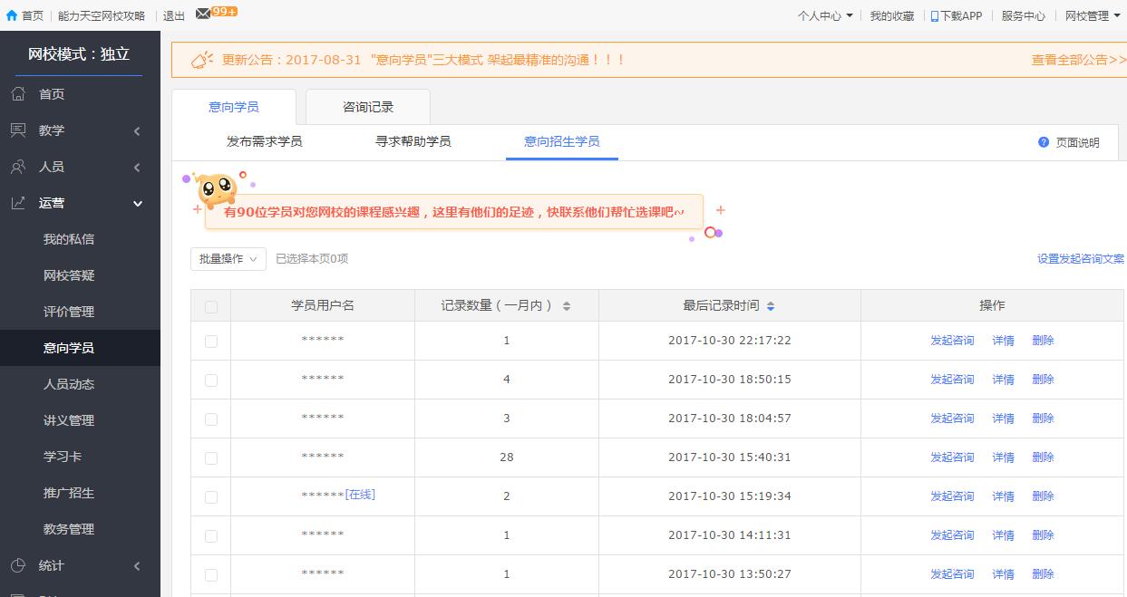 “意向?qū)W員”功能就在網(wǎng)校的運營版塊中,詳情里就能夠看到某個學員具體瀏覽了哪些課程,瀏覽次數(shù)越多的課程,自然購買意愿就越高了,每一個意向?qū)W員發(fā)起咨詢只需要0.3元,0.3元換取一個真實的學員,還有什么比這個更劃算?