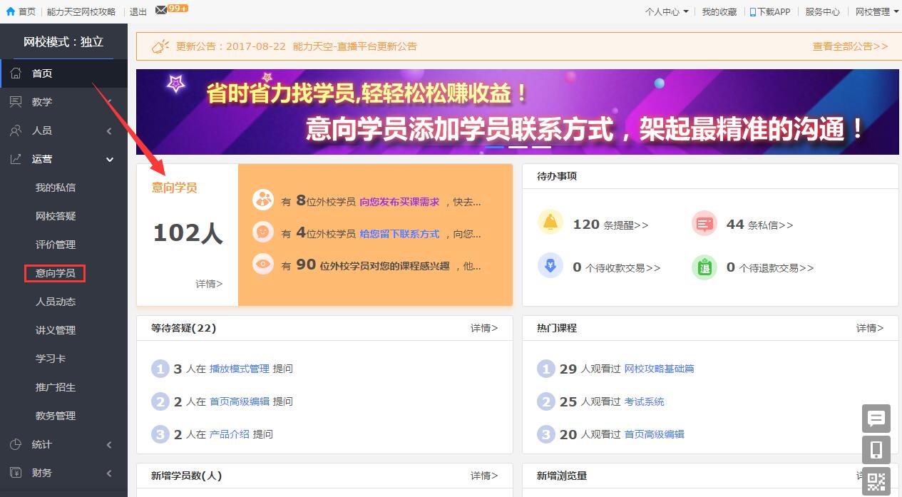 后臺首頁,直接看到意向?qū)W員的數(shù)據(jù),運營版塊下的“意向?qū)W員”,直接查看各個模式的詳細數(shù)據(jù)。