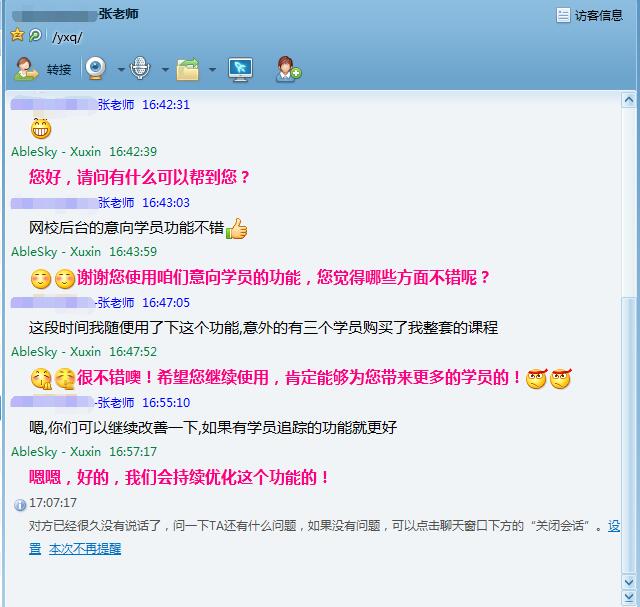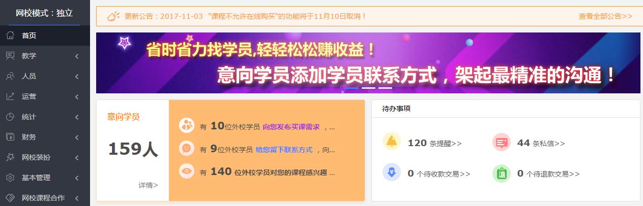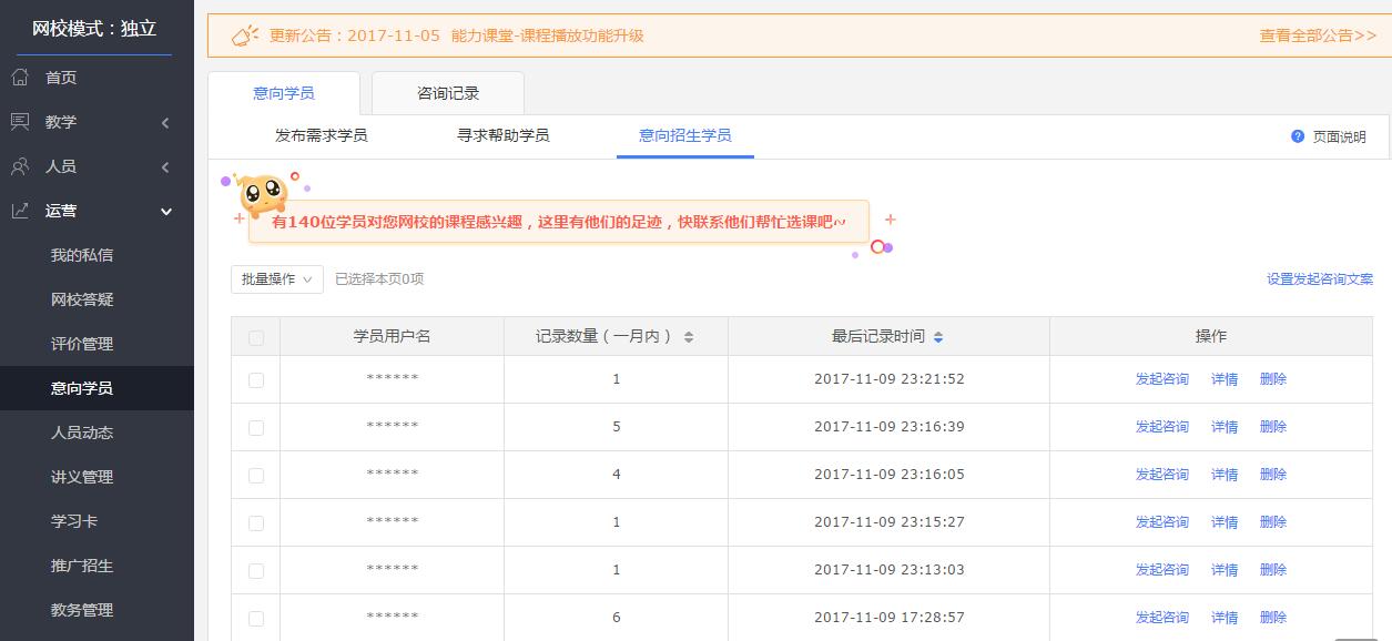 ,擔(dān)心功能在不完美的時候,能否得到各個網(wǎng)校的些許青睞。不管怎樣,我們都會堅持把這個功能做好,竭盡全力的幫助網(wǎng)校招生,就是抱著這樣的信念,我們的意向?qū)W員功能,為網(wǎng)校打開了招生的又一通路。![]()