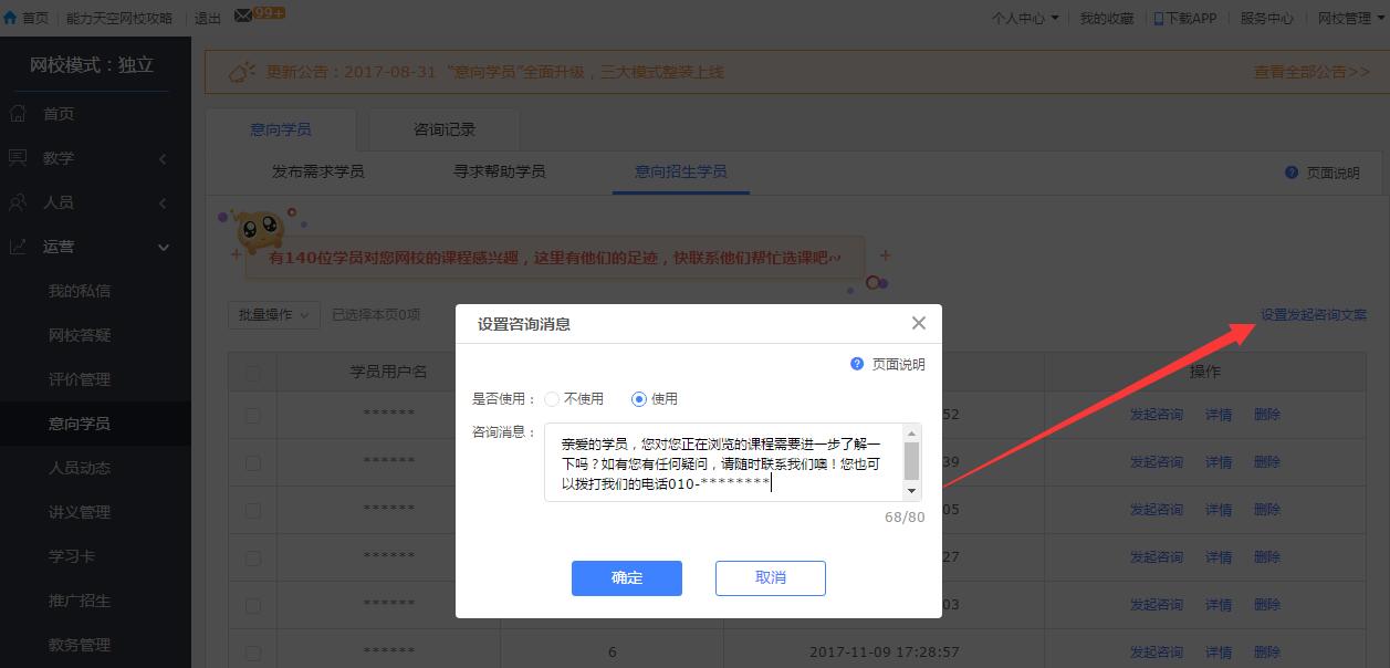 5、一定要設(shè)置”發(fā)起咨詢文案”,好的文案,會讓學(xué)員忍不住就聯(lián)系的網(wǎng)校老師的喲~~