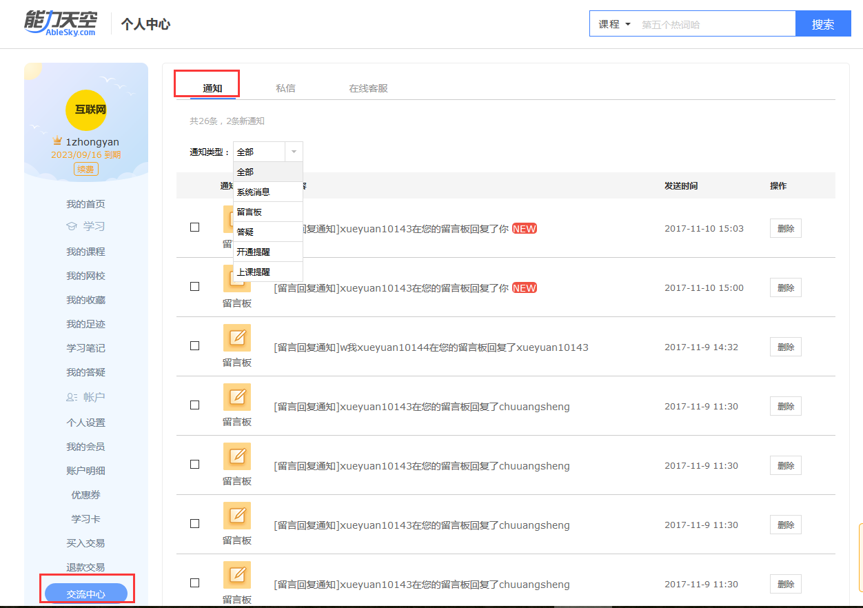 1. 整合通知類消息:留言板、答疑、開通提醒、上課提醒、其他系統(tǒng)消息統(tǒng)一整合入通知下,統(tǒng)一展示,可以區(qū)分類型進行篩選查看
