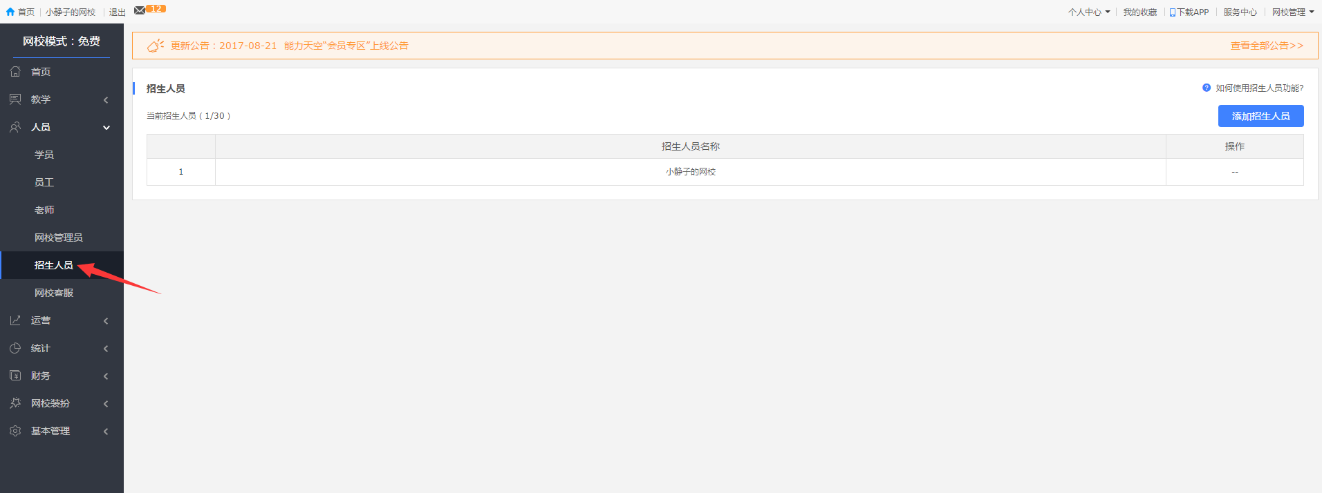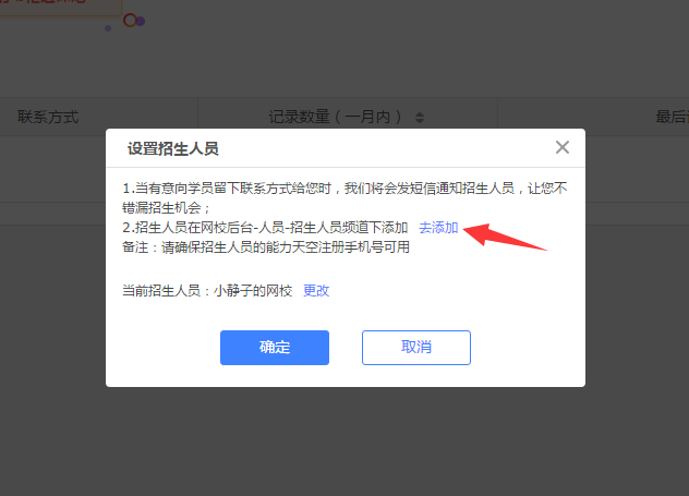 PS:考慮到網(wǎng)校的賬戶安全,和招生人員行使權(quán)力時(shí)的便捷性,目前僅支持添加網(wǎng)校的管理員為招生人員哦~暫不支持添加自由賬號(hào)作為招生人員呢![]()