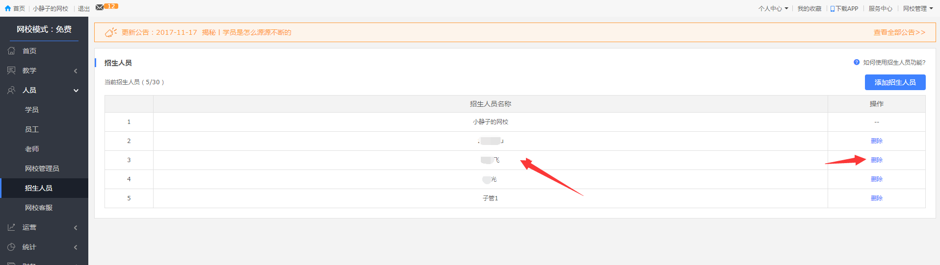 3.添加之后還可以刪除招生人員哦~~如果涉及網(wǎng)校內(nèi)人員身份變動(dòng),可以在招生人員列表將其刪除(放心,不會(huì)影響該賬號(hào)的管理員性質(zhì)和賬號(hào)的正常使用,僅僅是刪掉了招生的角色而已~~