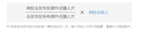 各個(gè)網(wǎng)校按照參與課程的課件播放次數(shù)占比進(jìn)行結(jié)算,公式如下: