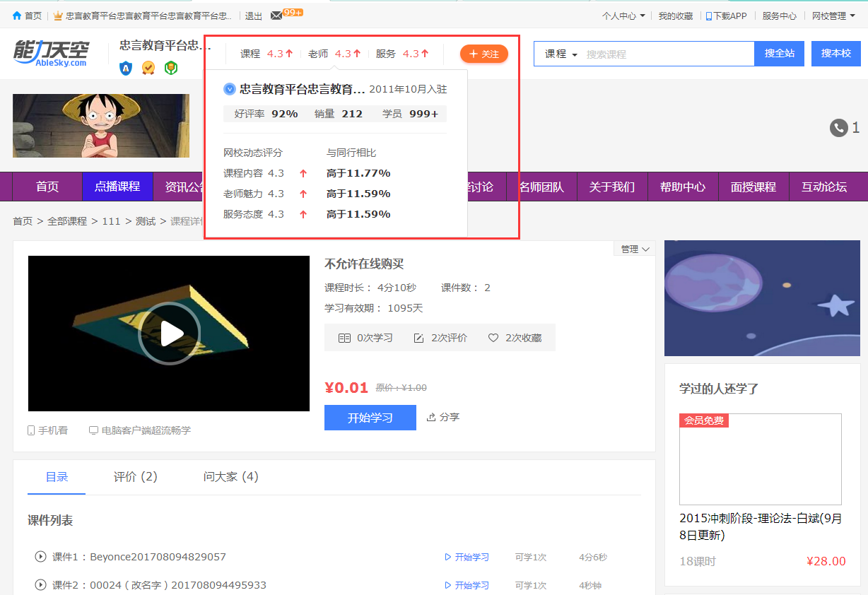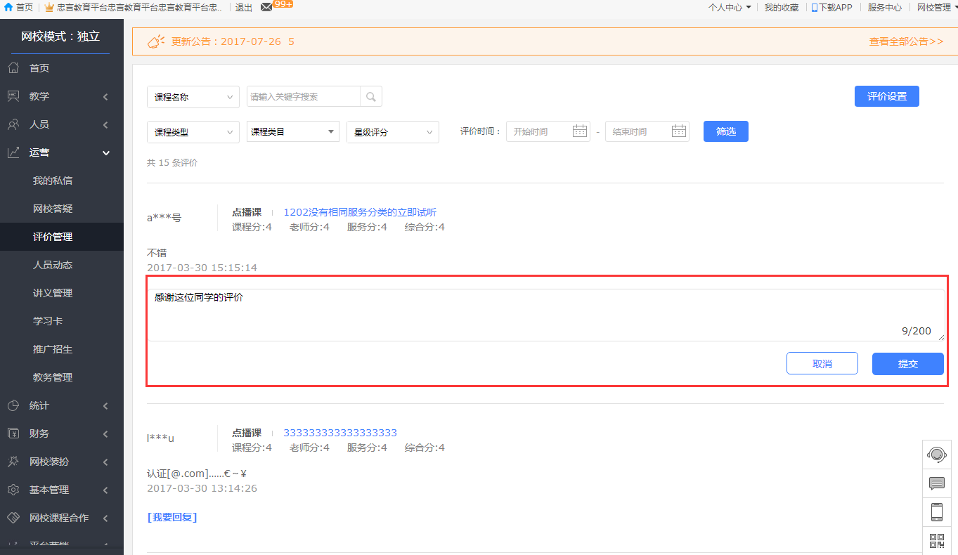 7、網(wǎng)??梢詫W員的評價進行回復,您的意見會很快的到網(wǎng)校的重視和回應