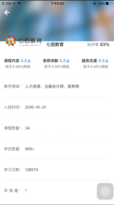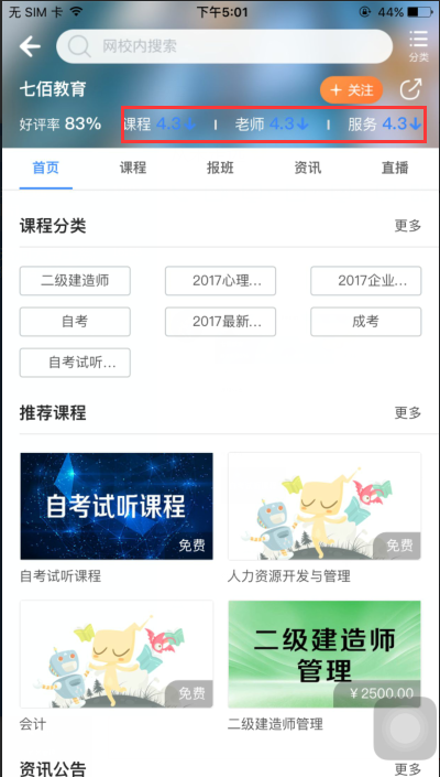 - 6、新增加了網(wǎng)校的動(dòng)態(tài)分?jǐn)?shù)展示,從課程內(nèi)容、老師魅力、網(wǎng)校服務(wù)三個(gè)維度,全面幫助學(xué)員了解、選擇網(wǎng)校,媽媽再也不用擔(dān)心我找不到好網(wǎng)校了