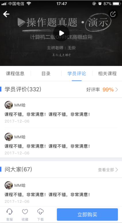- 4、課程評(píng)價(jià)分增加了好評(píng)率展示、還可以直接篩選好評(píng)中評(píng)差評(píng),還有更加有針對(duì)性的內(nèi)容,真實(shí)反映出課程是否優(yōu)質(zhì),您的評(píng)價(jià)也會(huì)幫助新選課的學(xué)員的~\(≧▽≦)/~