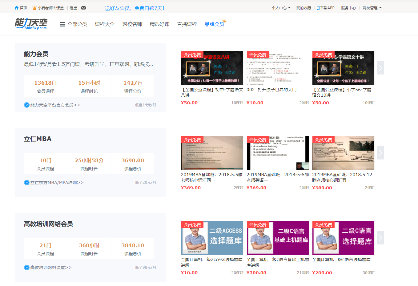 網校會員是能力天空為網校打造的新型課程銷售方式,網校可以將自己的課程打包成會員課包,按照時間周期以月、季、年卡的形式來售賣。