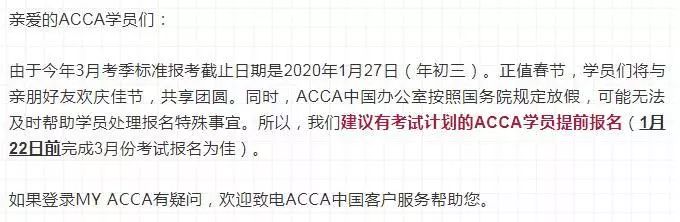 2020年3月考季標(biāo)準(zhǔn)報(bào)考截止日期是2020年1月27日(年初三)。ACCA中國(guó)辦公室將按照國(guó)務(wù)院規(guī)定放假,可能無(wú)法及時(shí)幫助學(xué)員處理報(bào)名特殊事宜。所以,官方建議有考試計(jì)劃的ACCA學(xué)員提前報(bào)名(1月22日前完成3月份考試報(bào)名為佳)。
