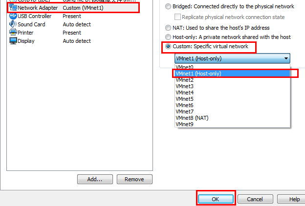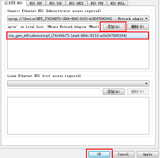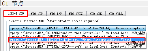 3) 在以太網(wǎng)NIO選項(xiàng)卡下的網(wǎng)絡(luò)適配器下拉菜單中選擇VMware網(wǎng)絡(luò)適配器VMnet1。