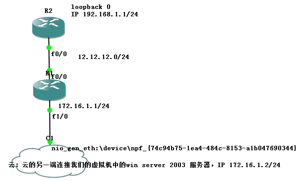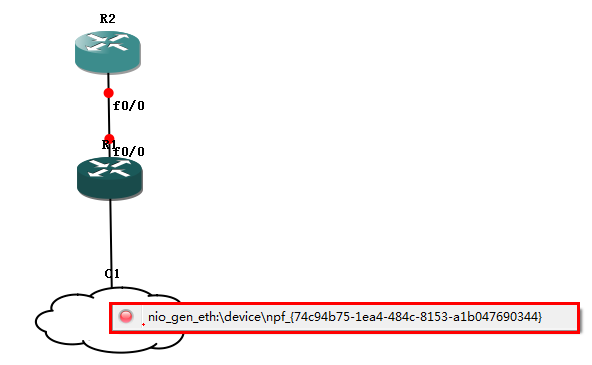 5) 在圖中點(diǎn)擊添加鏈接——>選擇快速以太鏈路連接R2和R1以及R1和云C1,并點(diǎn)擊在云C1上產(chǎn)生的網(wǎng)卡適配器建立連接。網(wǎng)絡(luò)拓?fù)浯罱ㄍ瓿?,與最初給出的環(huán)境相同,按開機(jī)鍵后進(jìn)行一系列相關(guān)配置。