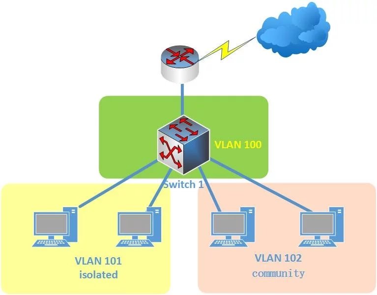 在Private VLAN的概念中,交換機(jī)端口有三種類型:Isolated port,Community port, Promisc-uous port;它們分別對(duì)應(yīng)不同的VLAN類型:Isolated port屬于Isolated PVLAN,Community port屬于Community PVLAN,而代表一個(gè)Private VLAN整體的是Primary VLAN,前面兩類VLAN需要和它綁定在一起,同時(shí)它還包括Promiscuous port。