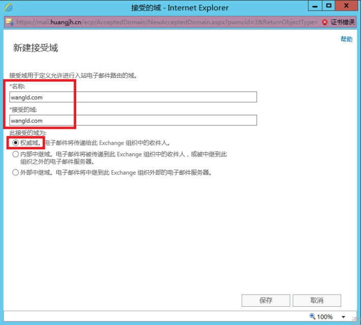 本地圖片,請重新上傳  在新建接受域頁面中,輸入名稱和接受的域,并選擇“權(quán)威域”----點擊“保存”,如圖2