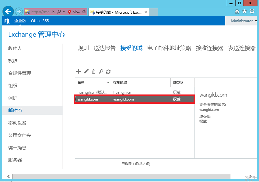 安裝完Exchange后,默認會創(chuàng)建一個接受的域,此域與內(nèi)部域名一致。由于我們使用的公網(wǎng)域名是wangld.com, 而內(nèi)部域名是huangjh.cn。所以我們還必須創(chuàng)建域名wangld.com.