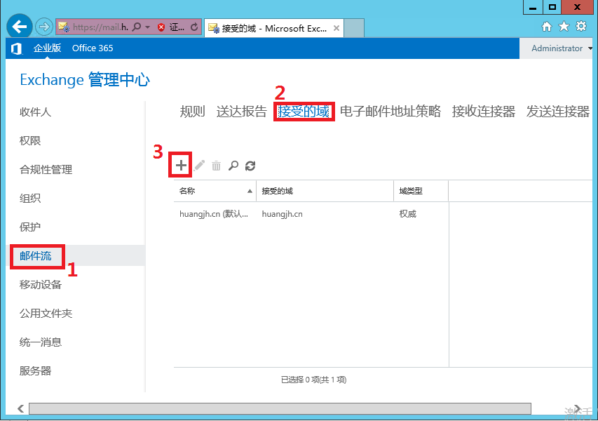 本地圖片,請重新上傳  打開ECP管理中心,打開“郵件流”---“接受的域”,點擊添加。如圖1