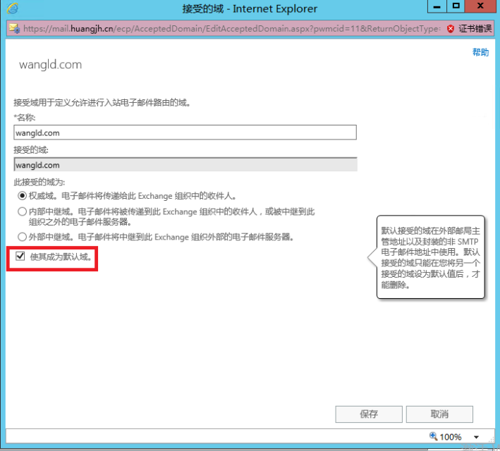 選中新建的域“wangld.com”,雙擊打開----勾選“使其成為默認域”---點擊“保存”,如圖4