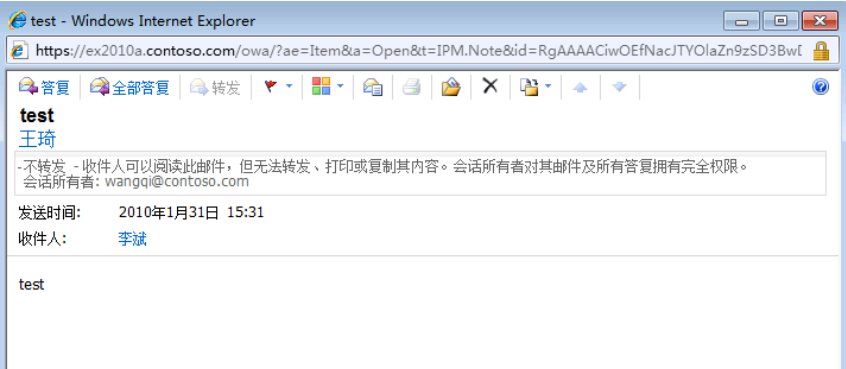 収送一封測(cè)試郵件給用戶contosoliliang 和contosolibin,幵設(shè)置權(quán)限為IE E-mail Policy