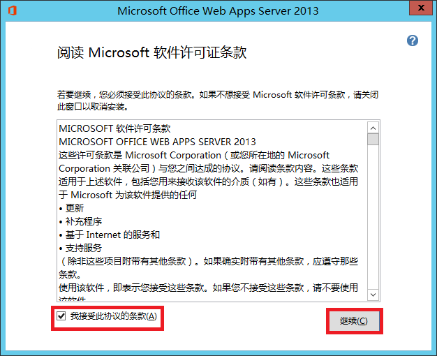 運(yùn)行并安裝OfficeWeb App Server 2013, 勾選“接受條款”---“繼續(xù)”,如圖9