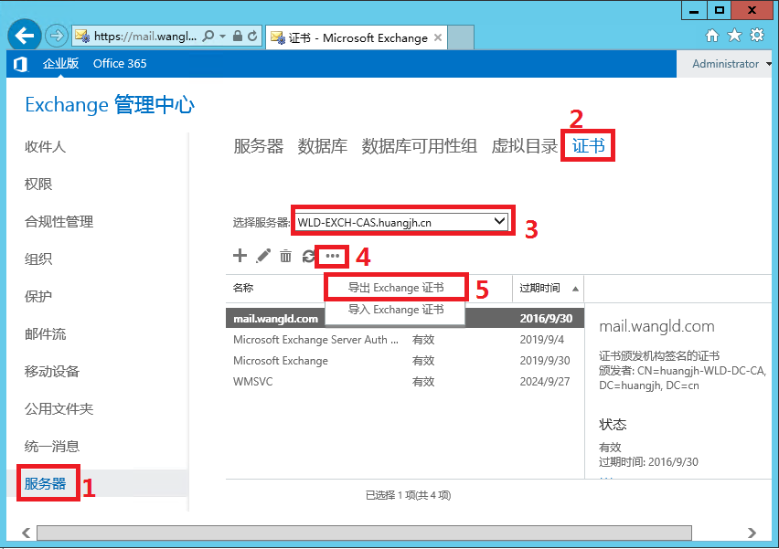 從Exchange ECP管理中心導(dǎo)出證書,轉(zhuǎn)到“服務(wù)器”---“證書”---選擇客戶端訪問服務(wù)器----點(diǎn)擊“導(dǎo)出證書”,如圖2