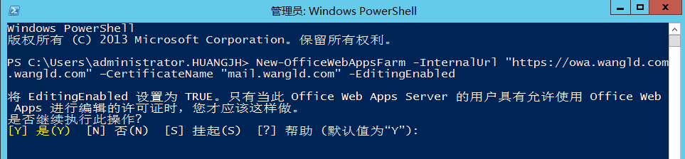 New-OfficeWebAppsFarm -InternalUrl "https://owa.wangld.com" -ExternalUrl "https://owa.wangld.com" –CertificateName "mail.wangld.com" –EditingEnabled,如圖12