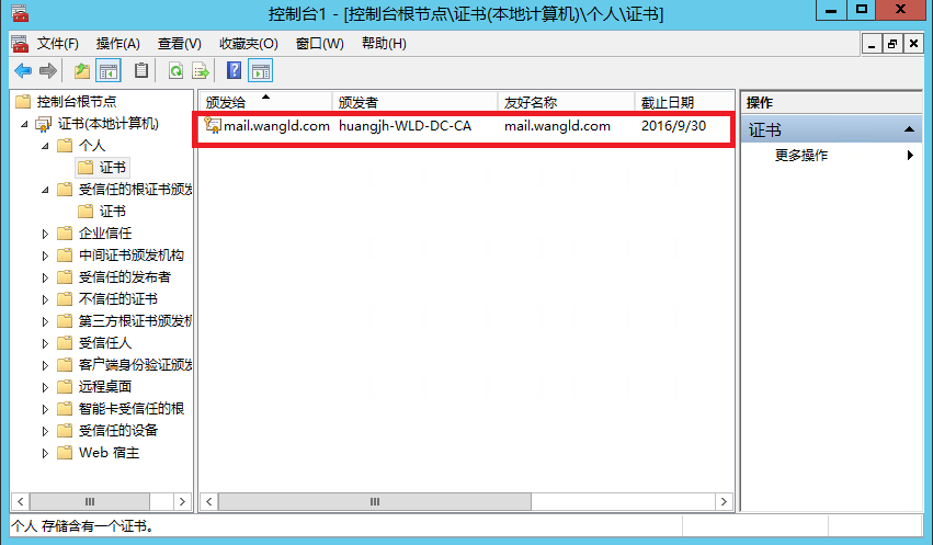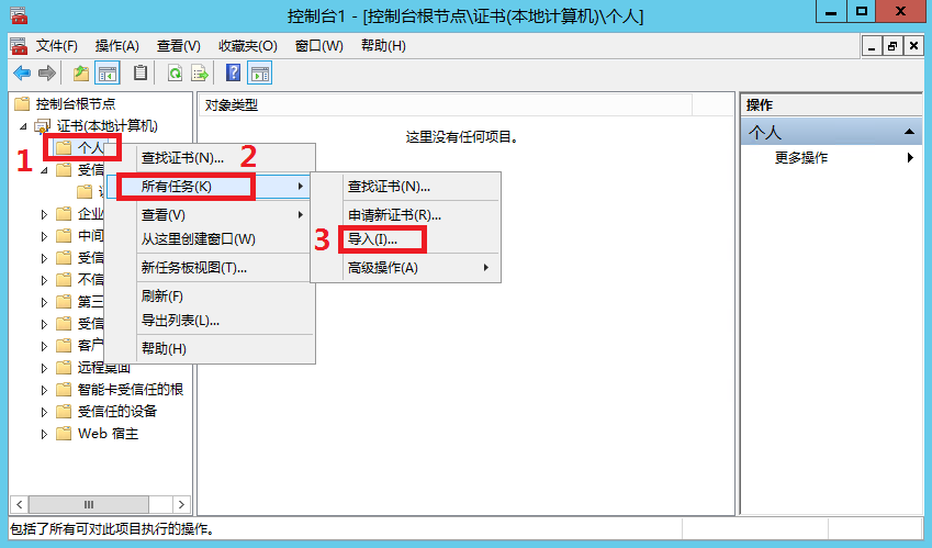將導(dǎo)出的證書復(fù)制到OWA服務(wù)器-----在OWA服務(wù)器打開MMC控制臺,“個人”---“所有任務(wù)”—“導(dǎo)入”,如圖4