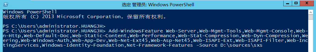 Web-Default-Doc,Web-Static-Content,Web-Performance,Web-Stat-Compression,Web-Dyn-Compression,Web-Security,Web-Filtering,Web-Windows-Auth,Web-App-Dev,Web-Net-Ext45,Web-Asp-Net45,Web-ISAPI-Ext,Web-ISAPI-Filter,Web-Includes,InkandHandwritingServices,Windows-Identity-Foundation,Net-Framework-Features-Source D:\sources\sxs,如圖1