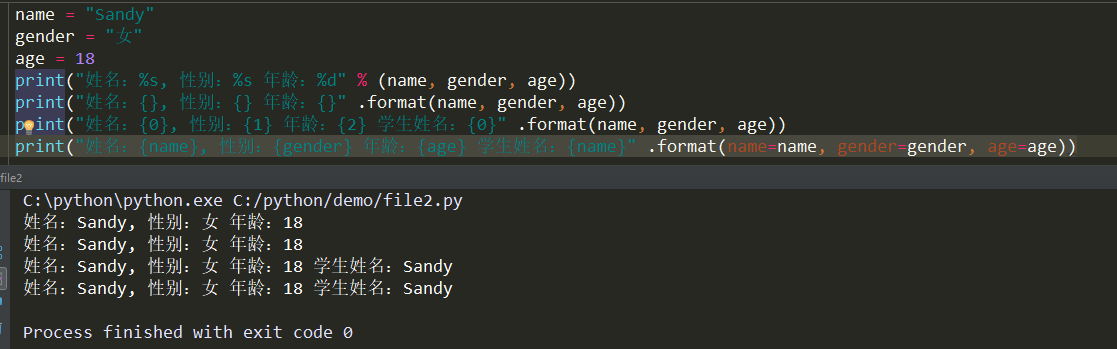 print("姓名:{0}, 性別:{1} 年齡:{2} 學(xué)生姓名:{0}" .format(name, gender, age))