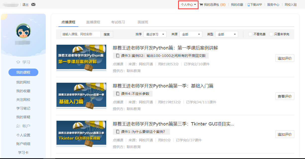支付成功后,購買完成,在“個人中心”可以看到課程信息。