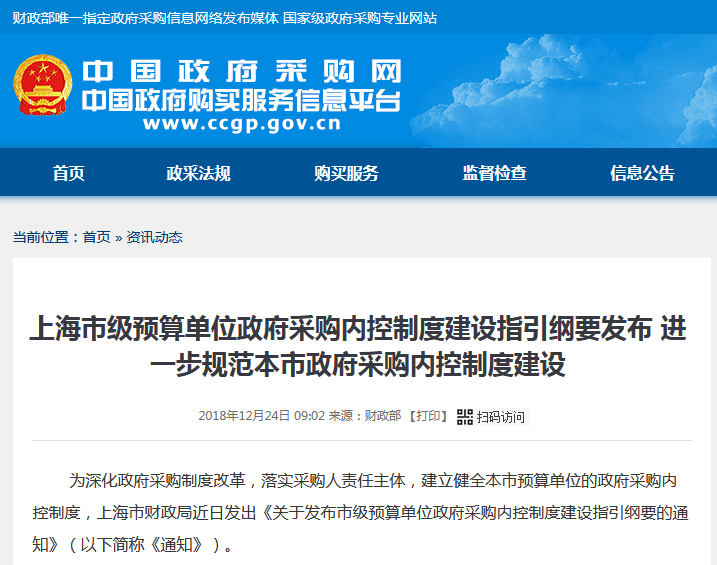 上海市級(jí)預(yù)算單位政府采購(gòu)內(nèi)控制度建設(shè)指引綱要發(fā)布?進(jìn)一步規(guī)范本市政府采購(gòu)內(nèi)控制度建設(shè)