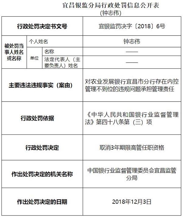 宜銀監(jiān)罰決字〔2018〕6號顯示,鐘志偉對農(nóng)業(yè)發(fā)展銀行宜昌市分行存在內(nèi)控管理不到位的違規(guī)問題承擔(dān)管理責(zé)任,依據(jù)《中華人民共和國銀行業(yè)監(jiān)督管理法》第四十八條第(三)項(xiàng),被中國銀行業(yè)監(jiān)督管理委員會宜昌監(jiān)管分局處以取消3年期限高管任職資格的行政處罰。
