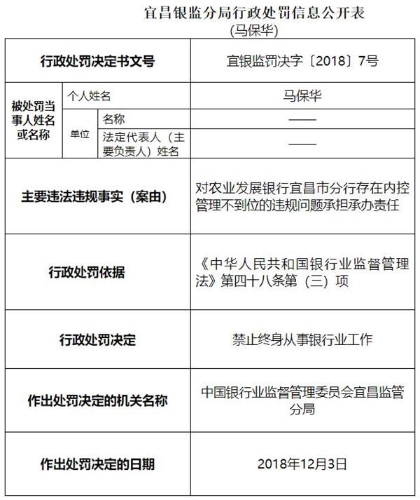 宜銀監(jiān)罰決字〔2018〕7號顯示,馬保華對農(nóng)業(yè)發(fā)展銀行宜昌市分行存在內(nèi)控管理不到位的違規(guī)問題承擔(dān)承辦責(zé)任,依據(jù)《中華人民共和國銀行業(yè)監(jiān)督管理法》第四十八條第(三)項(xiàng),被中國銀行業(yè)監(jiān)督管理委員會宜昌監(jiān)管分局處以禁止終身從事銀行業(yè)工作的行政處罰。