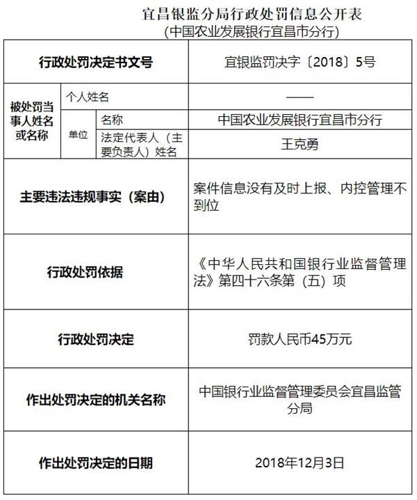 宜銀監(jiān)罰決字〔2018〕5號顯示,中國農(nóng)業(yè)發(fā)展銀行宜昌市分行案件信息沒有及時上報、內(nèi)控管理不到位,依據(jù)《中華人民共和國銀行業(yè)監(jiān)督管理法》第四十六條第(五)項(xiàng),被中國銀行業(yè)監(jiān)督管理委員會宜昌監(jiān)管分局處以罰款人民幣45萬元。