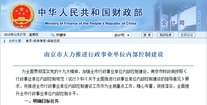 為全面貫徹落實黨的十九大精神,加強全市行政事業(yè)單位內(nèi)部控制建設(shè),南京市財政局按照《行政事業(yè)單位內(nèi)部控制規(guī)范(試行》和《關(guān)于全面推進行政事業(yè)單位內(nèi)部控制建設(shè)的指導(dǎo)意見》要求,將推進全市行政事業(yè)單位內(nèi)部控制建設(shè)工作作為全局重點工作,精心布署,狠抓落實,全面提升全市行政事業(yè)單位內(nèi)部控制水平。