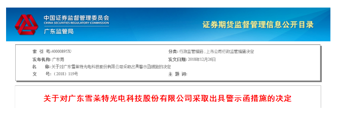 12月27日,廣東雪萊特光電科技股份有限公司因信息披露、公司治理與內(nèi)部控制方面的違規(guī)行為,公司及董事長(zhǎng),總裁兼財(cái)務(wù)負(fù)責(zé)人和董事會(huì)秘書一同被采取出具警示函的行政監(jiān)管措施。
