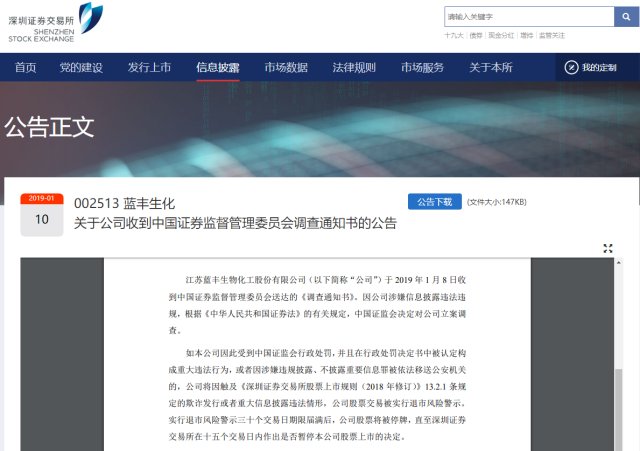 藍豐生化9日公告,公司于2019年1月8日收到中國證券監(jiān)督管理委員會送達的《調(diào)查通知書》。因公司涉嫌信息披露違法違規(guī),根據(jù)《中華人民共和國證券法》的有關(guān)規(guī)定,中國證監(jiān)會決定對公司立案調(diào)查。公告同時提示公司股票或有被實行退市風(fēng)險警示、停牌直至?xí)和I鲜械娘L(fēng)險。