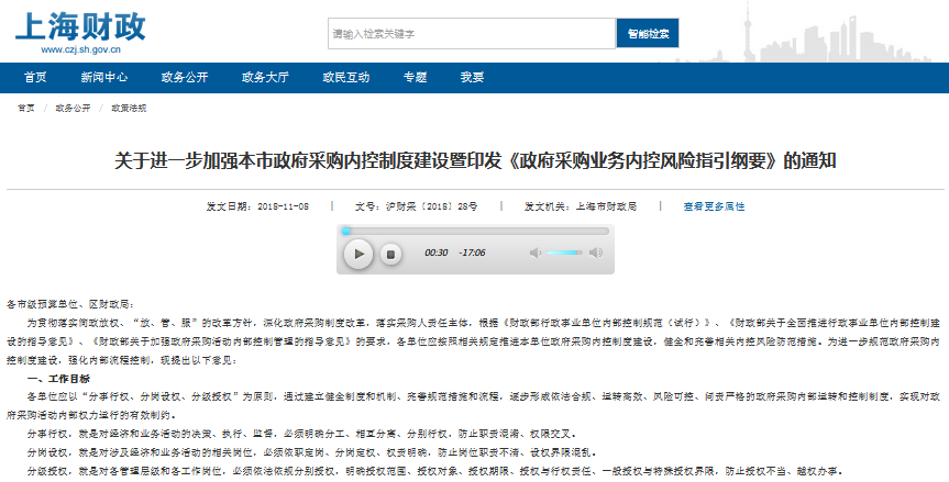 關(guān)于進一步加強上海市政府采購內(nèi)控制度建設(shè)暨印發(fā)《政府采購業(yè)務(wù)內(nèi)控風險指引綱要》的通知
