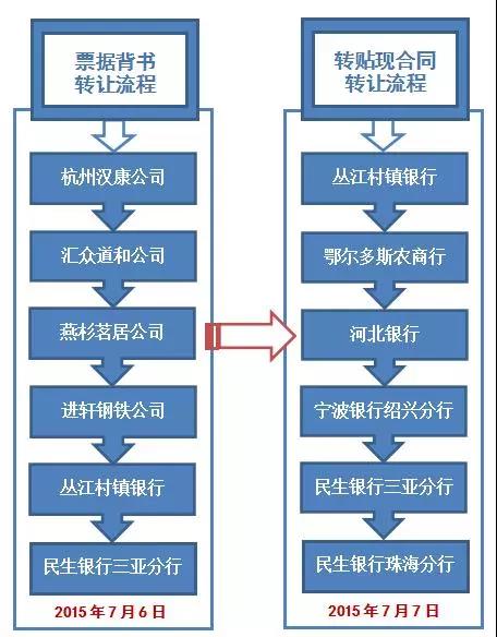 背書轉(zhuǎn)讓的第二天即7月2日,季銘銘和孫占新通過私刻的公章自行制作了《商業(yè)承兌匯票轉(zhuǎn)貼現(xiàn)合同》,冒充庫車村鎮(zhèn)銀行與內(nèi)蒙古鄂爾多斯農(nóng)商行簽訂合同并將這6張匯票轉(zhuǎn)給后者。6億元票據(jù)對應(yīng)的資金通過層層轉(zhuǎn)貼現(xiàn)及扣除過橋費(fèi)后最終從民生銀行三亞分行到了庫車村鎮(zhèn)銀行。