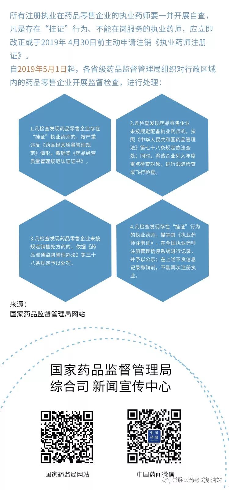 近日,國家藥監(jiān)局官網(wǎng)再次對執(zhí)業(yè)藥師“報(bào)考條件”“掛證整治”進(jìn)行解讀,并回答了現(xiàn)在執(zhí)業(yè)藥師最關(guān)注的6個(gè)問題。以下是圖解全文: