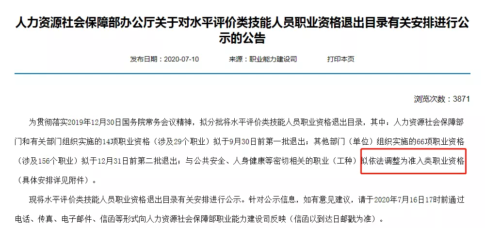 另外,公告中還提到:與公共安全、人身健康等密切相關(guān)的職業(yè)(工種)擬依法調(diào)整為準(zhǔn)入類職業(yè)資格。