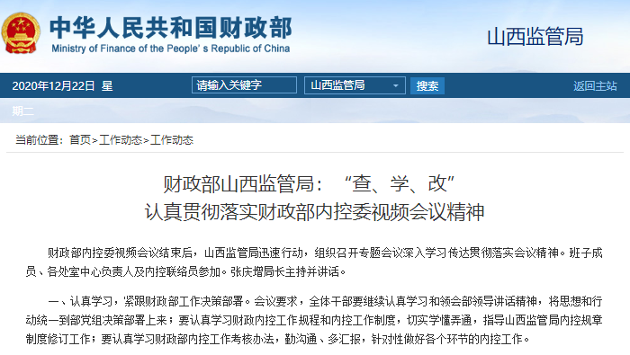 財政部山西監(jiān)管局:“查、學(xué)、改”?認真貫徹落實財政部內(nèi)控委視頻會議精神