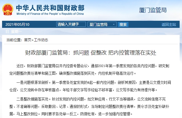 近日,財(cái)政部廈門(mén)監(jiān)管局召開(kāi)內(nèi)控委專(zhuān)題會(huì)議,通報(bào)2021年第一季度發(fā)現(xiàn)的各類(lèi)內(nèi)控問(wèn)題,研究制定問(wèn)題整改責(zé)任清單和施工圖,確保整改措施落到實(shí)處,內(nèi)控機(jī)制平穩(wěn)高效運(yùn)行。