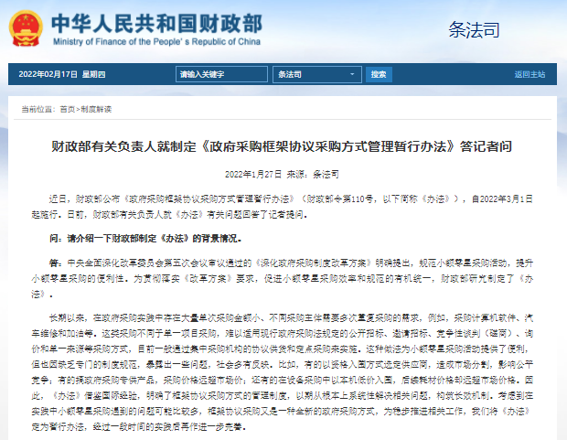 近日,財政部公布《政府采購框架協(xié)議采購方式管理暫行辦法》(財政部令第110號,以下簡稱《辦法》),自2022年3月1日起施行。日前,財政部有關負責人就《辦法》有關問題回答了記者提問。