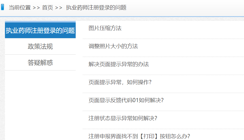3、此外,大家還可通過(guò)執(zhí)業(yè)藥師注冊(cè)平臺(tái)的【常見(jiàn)問(wèn)題解答】欄目,查詢(xún)執(zhí)業(yè)藥師注冊(cè)常見(jiàn)問(wèn)題解決方法。